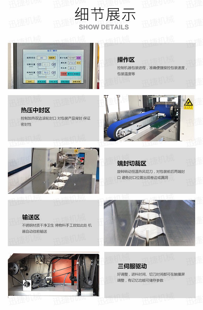 一次性口罩包裝設備口罩包裝機可用于餅干、月餅、蛋黃派、米餅、雪糕、方便面、巧克力等塊狀產(chǎn)品的包裝,特別適合于小批量單一產(chǎn)品的包裝。