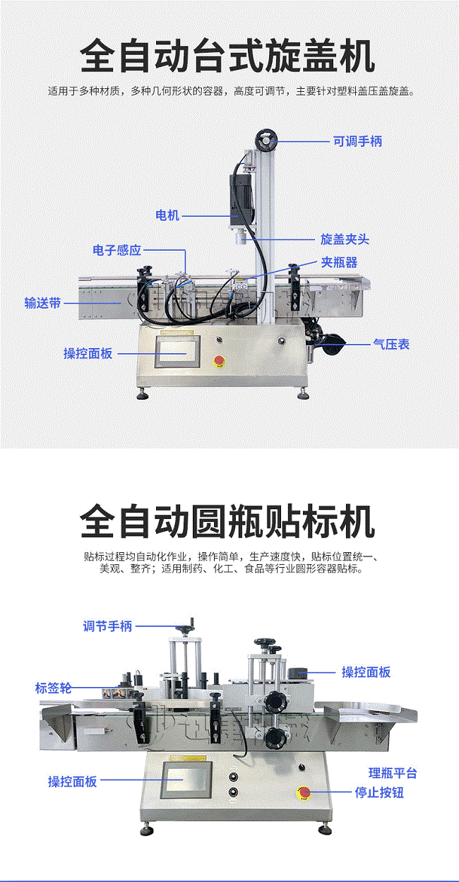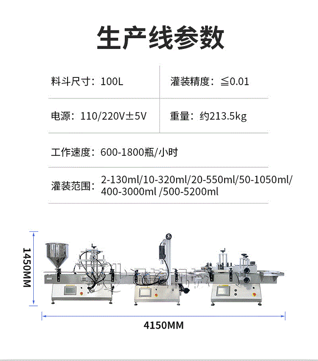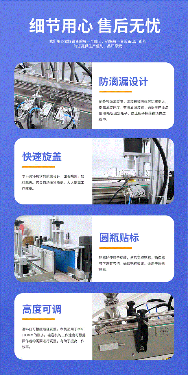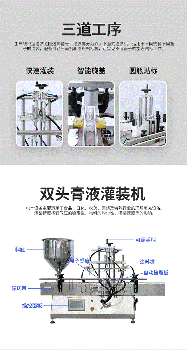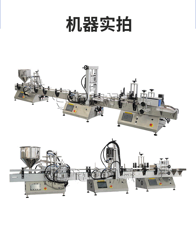 產(chǎn)品說明:生產(chǎn)線根據(jù)灌裝范圍選擇型號,灌裝部分為雙頭下潛式灌裝機(jī),適用于不同物料不同瓶子的灌裝,配備自動壓蓋機(jī)和圓瓶貼標(biāo)機(jī),可實(shí)現(xiàn)不同蓋子的旋蓋貼標(biāo)工作。