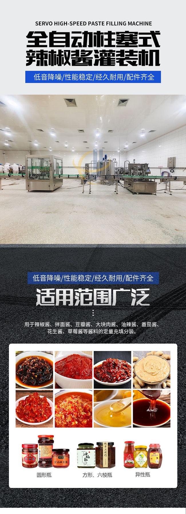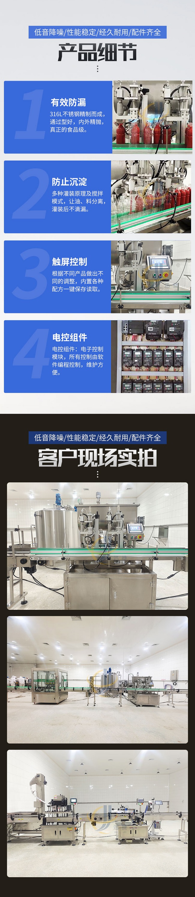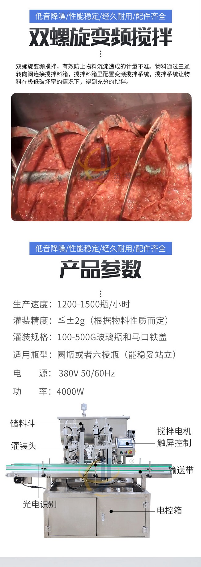 這款柱塞式辣椒醬灌裝機低音降噪、性能穩(wěn)定、經(jīng)久耐用、配件齊全,適用范圍廣泛用于辣椒醬、拌面醬、豆瓣醬、大塊肉醬、油辣醬、番茄醬花生醬、草莓醬等醬料的定量充填分裝。雙螺旋變頻攪拌,有效防止物料沉淀造成的計量不準(zhǔn)。物料通過三通轉(zhuǎn)向閥連接攪拌料箱,攪拌料箱里配置變頻攪拌系統(tǒng),攪拌系統(tǒng)讓物料在極低破壞率的情況下,得到充分的攪拌。