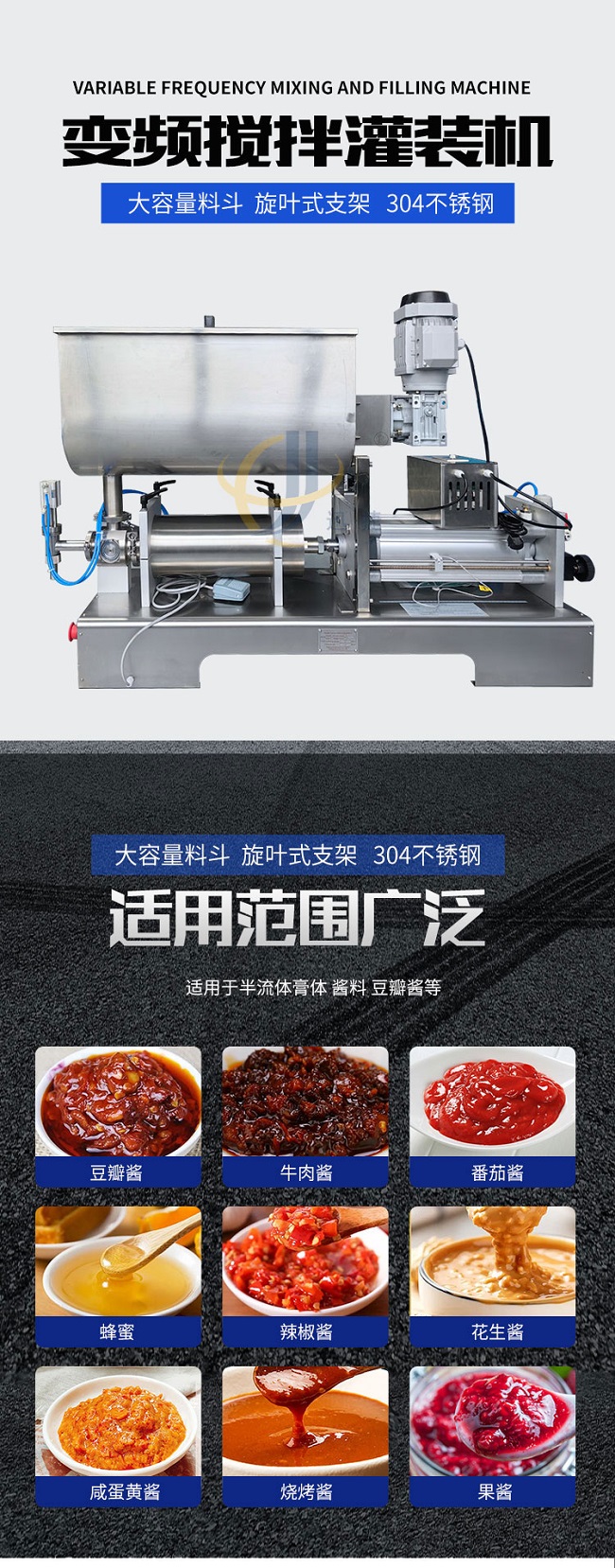 變頻攪拌醬料灌裝機(jī)采用大容量料斗、旋葉式支架、304不銹鋼,適用范圍廣。