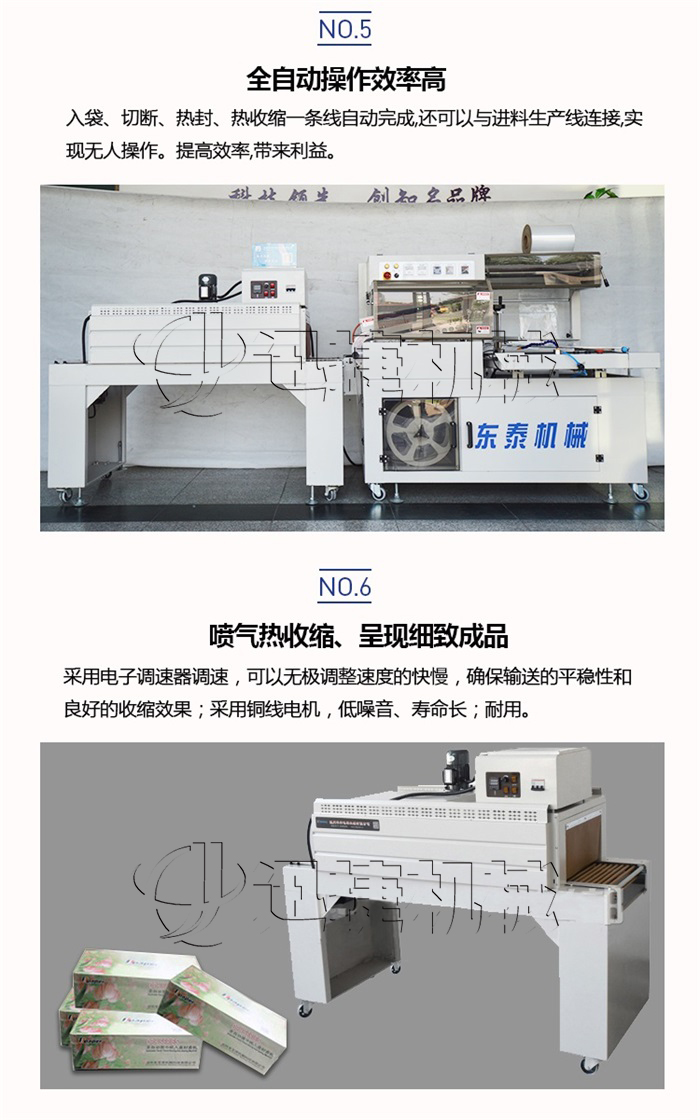全自動套膜收縮機是由全自動450L封切機和熱收縮機組成,入袋、切斷、熱封、熱收縮一條線自動完成,還可以與進料生產線連接,實現無人操作。提高效率,帶來利益。全自動化封切收割,適用于各種物品的套膜及收縮,生產效率高。