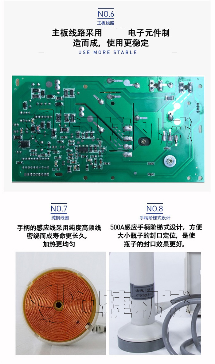 本手持式電磁感應(yīng)鋁箔封口機是利用電磁感應(yīng)的原理,將瓶口上的鋁箔片瞬間產(chǎn)生高熱,然后熔合在瓶口上,使達(dá)到封口的功能。具有良好的防潮、防霉、防偽作用,起到延長物品保存周期的目的。封口容器的材質(zhì)可以是聚乙(PE)、聚丙烯(PP)、聚酯(PET)、聚苯乙烯(PS)、ABS以及玻璃等,不能用于金屬瓶體及瓶蓋。(本公司同時提供各種材料感應(yīng)鋁箔膜)。